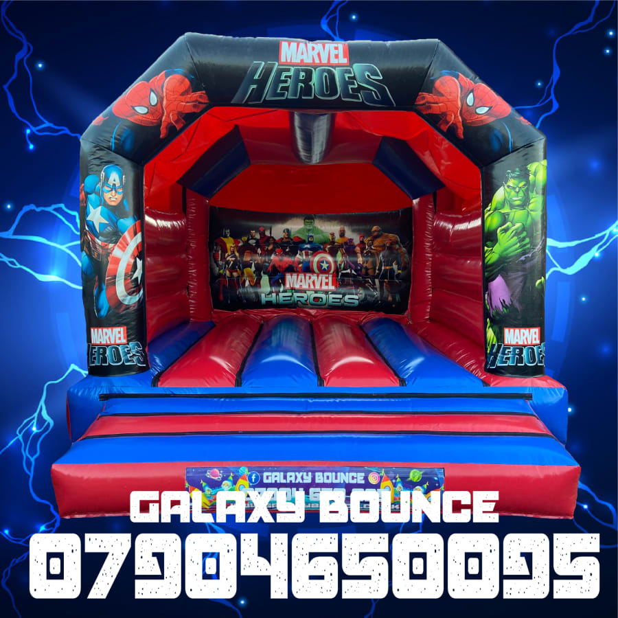 12ft x 15ft Marvel Super Heroes Bouncy castle hire in Liverpool Widnes, Warrington, Runcorn and St. Helens.