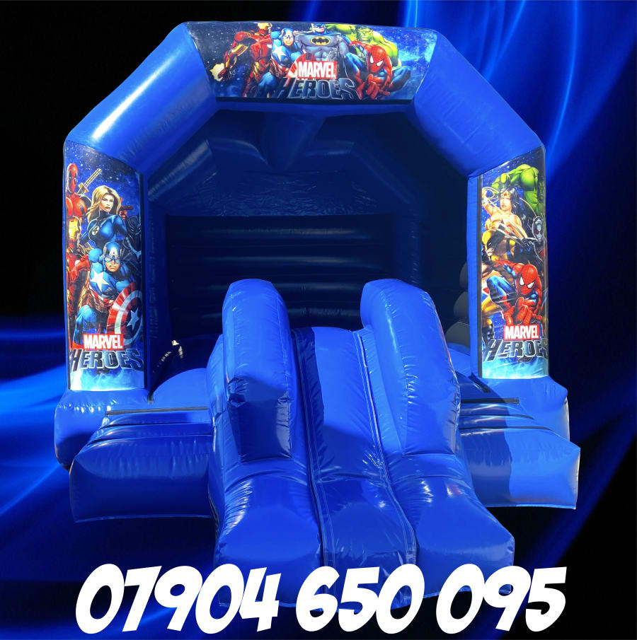 12ft x 17ft Super Heroes Slide Bouncy castle hire in Liverpool Widnes, Warrington, Runcorn and St. Helens.
