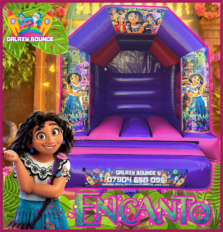 Encanto Bouncy Castle hire in Widnes and surrounding areas. This stunning Purple and Pink Bouncy castle features the award winning Magical Encanto! This bouncy castle features all of the Encanto characters including Mirabel, Luisa, Isabela, Peppa, Dolores and the magical enchanted house! We dont talk about Bruno but we do talk about how stunning this magical bouncy castle is!