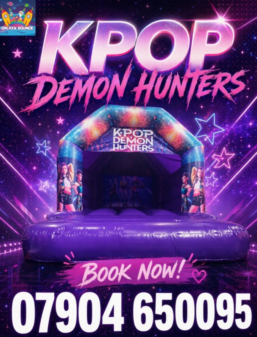 K POP Bouncy Castle hire in Widnes and surrounding areas. This stunning Purple and Pink Bouncy castle features the award winning Magical K POP Demon Hunters! This bouncy castle features all of the Demon Hunters characters including Zoey, Rumi, Mira.